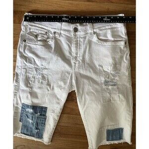 True Religion Size 33 White and Blue Patched “Ricky” Denim Shorts