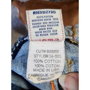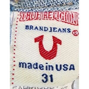 The True Religion Skirt in size 31 features a unique design with patches and distressed detailing, giving it a trendy and edgy look. Made with thick thread and a Woodstock-inspired theme, this skirt is perfect for women who want to make a statement with their fashion. The True Religion brand ensures high quality and style, making this skirt a standout piece in any wardrobe.