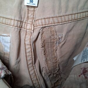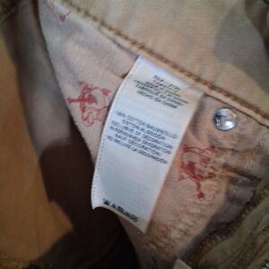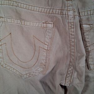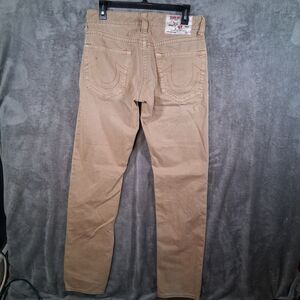 True religion MEGJ19EDI slim straw pants mens 30 inseam 33 rare pair in a rare color hard to find been professionally repaired see picture back pocket stitch and inside amazing work with same tread color matching 100% used good condition no rips tears or stains no visible flaws