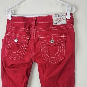 Bold red True Religion Stella skinny jeans featuring stretch denim and signature logo pocket stitching. Eye-catching color with a flattering low-rise fit.
