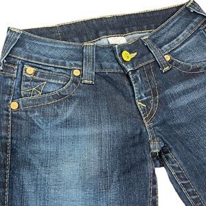 True Religion Straight Yellow Stitch / Buttons Flap Pocket Jeans Women's Size 26. Excellent condition. See photos for details and measurements. Dark / Medium wash. casual, preppy, hipster