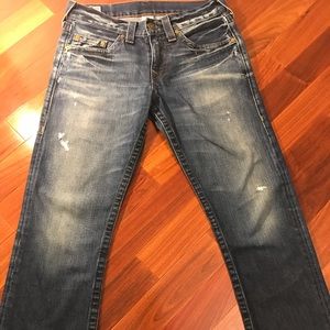 True Religion Straight legged jeans Midd wash with awesome whisker detail throughout the front and back of legs. No flaps pockets lightly worn