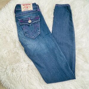 True Religion Super Skinny Distressed Blue Jeans Neon Purple with Flap
