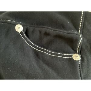 The True Religion Men's Sweat Shorts in size 3XL are a stylish and comfortable option for casual wear. Made from cotton fleece fabric in a solid black color, these jogger-style shorts feature an elastic waist with a drawstring for a customized fit. The design includes embroidered logo accents and slash pockets for added convenience. Perfect for travel or everyday wear during the warmer seasons, these shorts offer a blend of American casual style and quality craftsmanship.