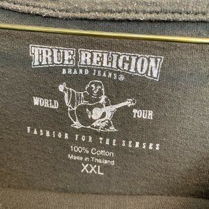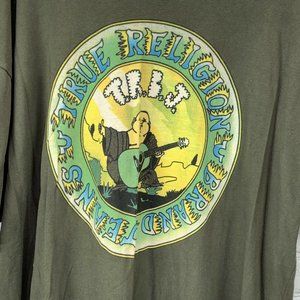 True Religion T Shirt size XXL Buddha Playing Guitar Graphic Spellout Olive Mens