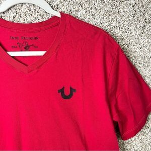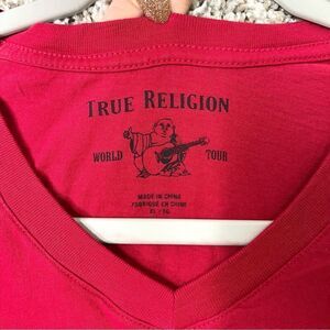 Excellent used Condition Men’s True Religion World Tour Red Soft V-Neck Short Sleeve Logo T-Shirt in Size X-Large
