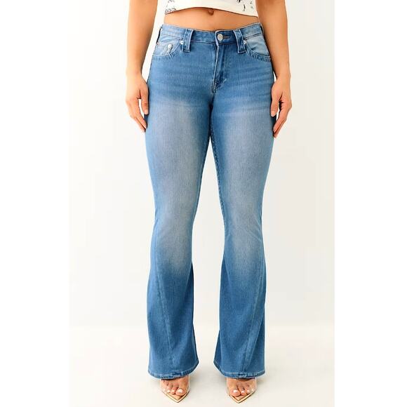 True Religion's Joey Mid-Rise Flared Jean brings together vintage retro appeal with contemporary fashion design. The flared shape creates a leg-lengthening effect while maintaining the brand's quality denim, ideal for casual styling.