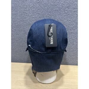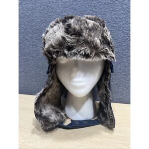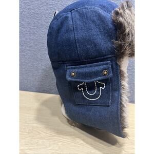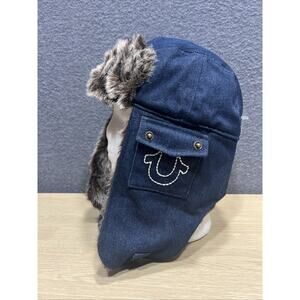 True Religion Trapper Hat Dark Blue Cotton Faux Fur Horseshoe Pockets Chin Strap