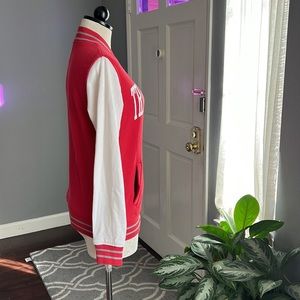 Pre-loved and recently washed. True Religion jacket size medium. Totally unisex style. True Religion written across the front. Soft zipped up jackets with pockets. Slightly Stand-up collar, long sleeves, 2 front slant pockets. The logo on the sleeve is slightly gray. There are two small stains at the front not too noticeable and two yellow spot on the sleeve. Front length 24 1/2” across chest 19” waist 17”. Material: 60% cotton 40% polyester.