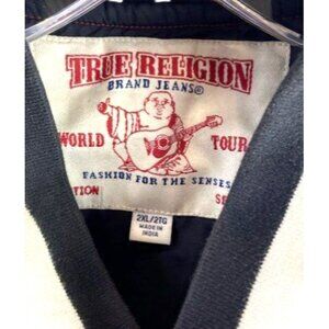 This True Religion varsity jacket combines style and comfort, featuring a bold red design with black accents. The jacket's durable nylon and cotton blend construction offers excellent wear resistance. Ideal for cooler weather, this jacket provides a classic look with modern appeal, perfect for adding a stylish edge to your wardrobe.