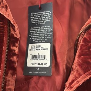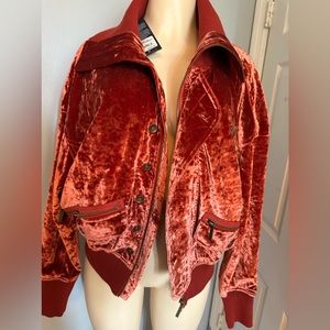Elegant velvet bomber jacket. Features a deep red color. Stylish and chic design.