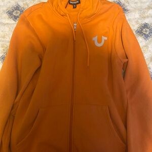 Vibrant orange hoodie with iconic logo. Cozy and trendy design.