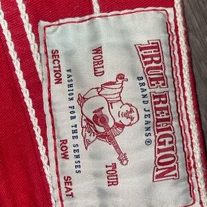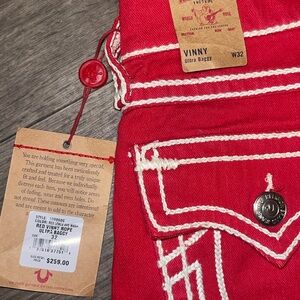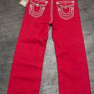 Bold red jeans with striking white stitching. Features signature True Religion design elements.