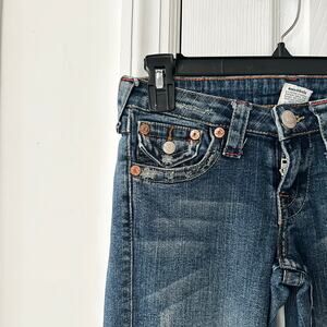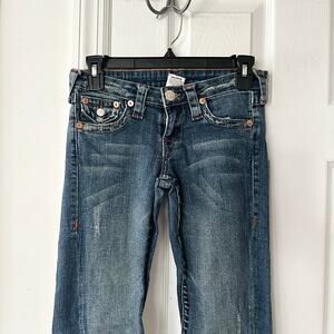 Size 24 from True Religion. Style name Bridget in wash Stone & Tint. Low rise Y2K vintage flare jeans with flap back pocket with button details and horseshoe stitching on pocket. Preowned in good condition with no stains or tears.