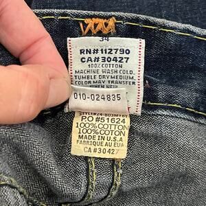 These True Religion Joey Super T jeans are a vintage Y2K gem! Featuring a classic 34x34 fit, these jeans boast eye-catching yellow/orange stitching and stylish flap pockets. They are a true statement piece that captures the essence of Y2K fashion. 100% cotton, made in the USA