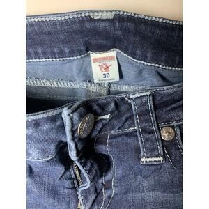 These True Religion jeans for women are slim straight pants made of a blend of cotton and rayon. They feature a solid blue color, zip closure, button and zipper accents, and pockets. The design is inspired by Western, nature, school, outdoor, classic, city, and Southwestern themes, making it suitable for casual occasions in all seasons.