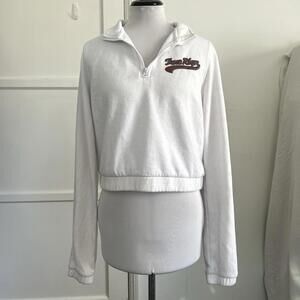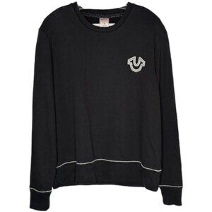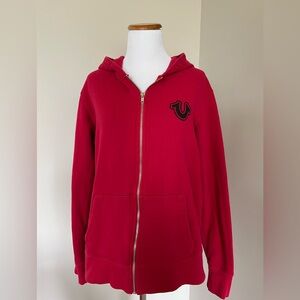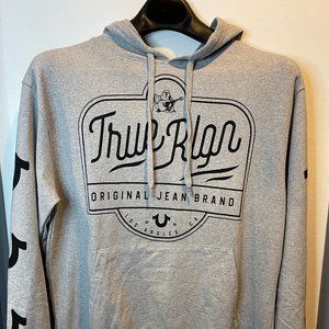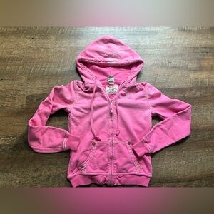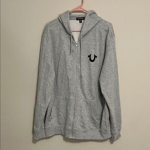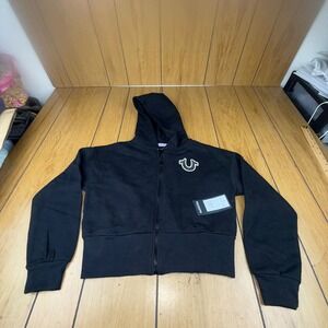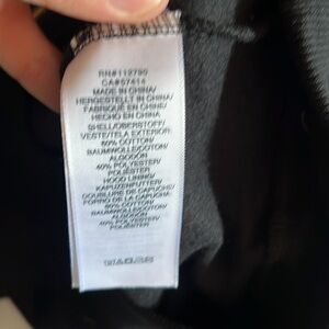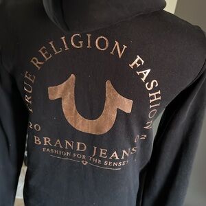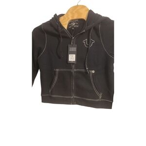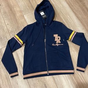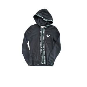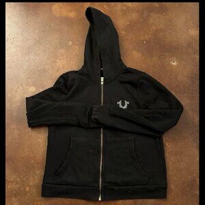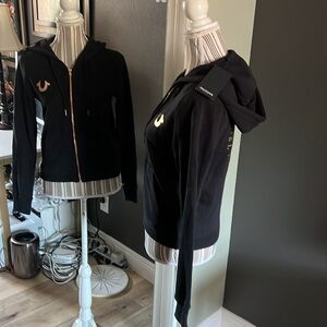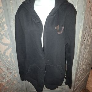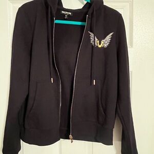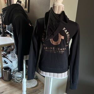 Chic black hoodie with gold details. Features front pockets and zip closure. Ideal for casual style.