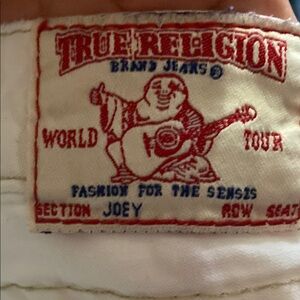 Stylish boot cut jeans by True Religion. Made in USA. Cream color.