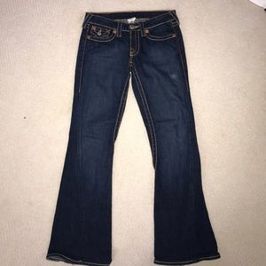 These are luxurious REAL True Religion Women's jeans. They have been very lightly worn and look brand new. They are dark blue fitted jeans that have a small flare at the ends and have signature thick orange stitching. The back pockets have the classic horseshoe stitching and so does the small pocket inside the front right pocket. All of the silver buttons say True Religion on them. They are a Women's 28.