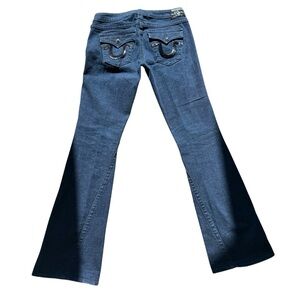 Keywords: True Religion, flared jeans, women's jeans, blue denim, medium wash, comfortable fit, flattering style, distinctive stitching, casual wear, 5-pocket design, button closure, cotton elastane blend, USA made, pre-owned jeans, stylish denim.