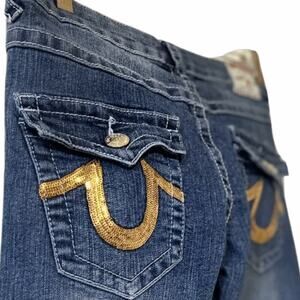 Elevate your denim game with these stunning True Religion Women's Jeans! This pair features a solid pattern and a medium wash, which pairs perfectly with the sequin and button accents. The Joey Super T Low Rise style and bootcut fit make these jeans a must-have in your wardrobe. These designer jeans are a stylish addition to any outfit.