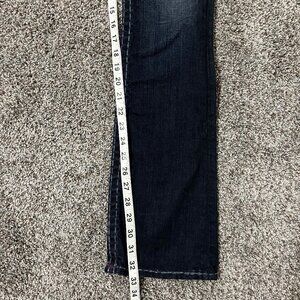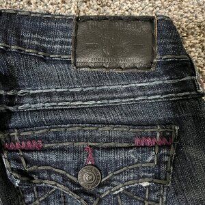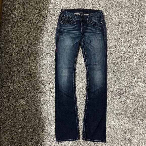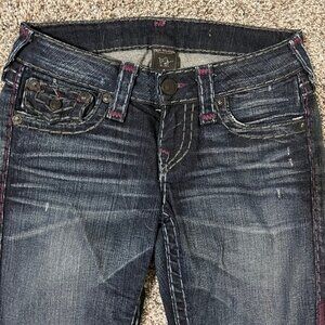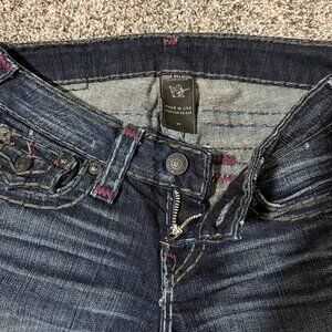 Crafted in a faded wash, these jeans feature a flattering hem, rose gold hardware, pink rope stitching, and our signature horseshoes on the back flap pockets.