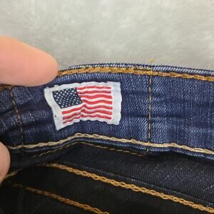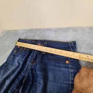 The product is a pair of True Religion women's jeans in size 26. These slim-fit, dark wash jeans feature a solid pattern, button closure, and are made from a cotton blend denim fabric. The jeans have a flattering skinny style with a 30.5-inch inseam and a stretch feature for added comfort. They are machine washable and have a designer theme, part of the True Religion Stella product line. The blue jeans also include a flap pocket for added style and functionality.
