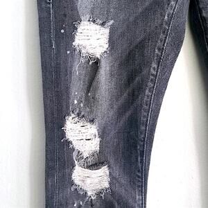 True Religion women’s jeans in washed black distressed denim with signature back flap pockets and tonal stitching. Women’s size 23. The heavy fade and worn-in texture give them a soft grunge edge with moto undertones, rugged yet styled. The distressing feels deliberate, adding dimension and lived-in character to the sleek low-rise cut.