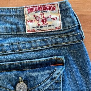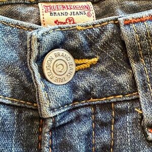 The True Religion Women's Joey Bermuda Cropped Shorts with Frayed Hem in a tag size 31. The actual waist size is 32. Made from a cotton blend denim fabric, these solid blue shorts feature a zip closure and a mid-rise waist. The frayed hem adds a trendy touch to the Bermuda style. With a 16" inseam and a flat front design, these True Religion shorts are both comfortable and fashionable for the warmer seasons of summer, fall, and spring.