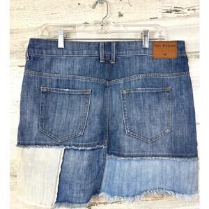 True Religion skirt, women’s L denim mini, patchwork jean skirt, boho denim skirt, blue zip mini, True Religion women’s clothing, designer jean skirt, vintage style mini denim