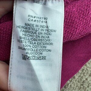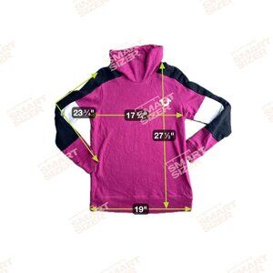 Small stain on front, I didn't attempt to get it out. The fabric feels like it hasn't been worn. Missing drawstring on cowl neck. Measurements: Chest = 17", Length = 27.5", Sleeve = 23.75".