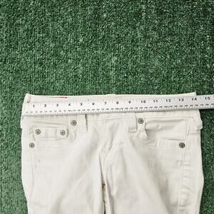 The True Religion Women's Size 27 White Lizzy Denim Summer Cropped Jeans are a stylish and comfortable option for summer wear. Made from denim fabric, these low-rise jeans feature a cropped style perfect for the season. With a waist size of 28 inches and an inseam of 23.5 inches, they are designed for a regular fit. The white color adds a chic touch to the classic denim silhouette, making them a versatile and trendy addition to any woman's wardrobe.