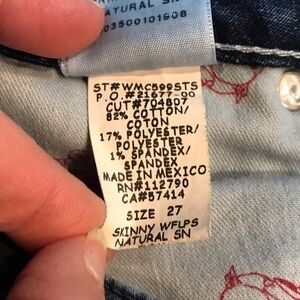 True Religion Women's “Skinny Natural” Jeans in “Winter Haze” is a low rise, super skinny, stretch denim in an ombre, acid-wash blue. Classic five pocket jeans with True Religion hardware and U stitched back pockets. 82% cotton, 17% polyester, 1% spandex blend. Made in Mexico.