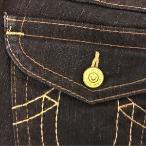 True Religion Womens Style# WC92075E4 Twist Leg Jeans Size 31 Yellow Button. These are in good pre-owned condition with no distressing, please see pictures. Measurements waist is 18 inches and inseam is 30 inches