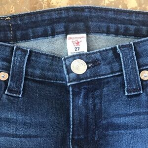True Religion women’s dark denim skinny jeans. Front pockets and back flap pockets with buttons. Machine was cold, 71% cotton, 18% polyester, 10% rayon, 1% elastine. Women’s size 27.
