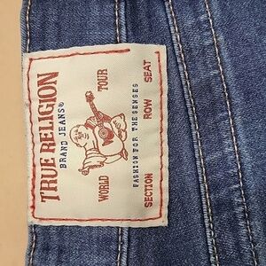 True Religion World Tour "Halle" Mid-Rise Super-Skinny Leg Jeans Size 29, Excellent Cond. Dark Wash. 65% Cotton, 22% Viscose, 12% Polyester, 1% Lyrca. Imported, Zipper closure, Machine Wash, 8.5" Mid rise, ankle skimming fit, Embroidered horseshoe logos on back pockets. Soft stretch denim. Please refer to measurements in photos to ensure proper fit.