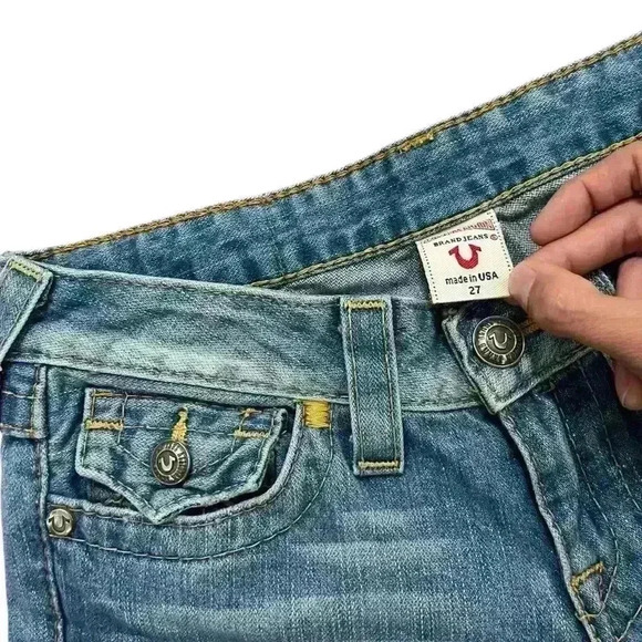 True religion light medium denim flare jeans. Button flap back pockets with yellow crazy stitch. Perfect for punkers! Distress in pockets and front of jeans by factory. Some stains shown on pictures.