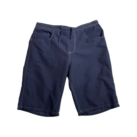 True Religion boys XL swim trunks. In navy blue with attached drawstring. In excellent used condition. No flaws. Measurements were taken flat and are approx: 14.5 waist, 10.5 rise and 19.5 length.