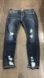 Dark blue cropped jeans with distressed details. Stylish and trendy design. Perfect for casual wear.