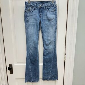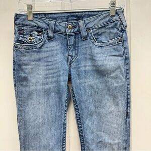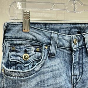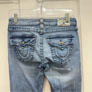 True Religion flare leg lightly distressed denim jeans women's 26 jewel accents (tried to photograph the 'sparkle' but it doesn't show up very well) inseam is 32.5