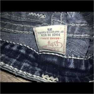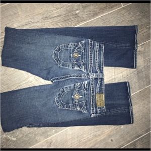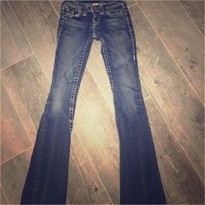 Pre owed, but great condition. Size 25x32 true Religion flap button back pocket dark denim flares.