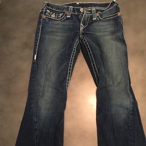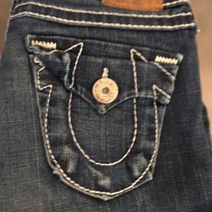 Beautiful True Religion dark wash white seems denim, size 27. Bootcut, in a great condition!