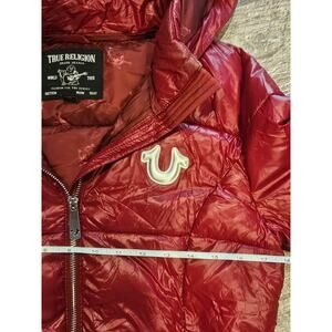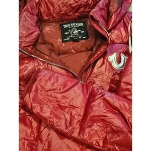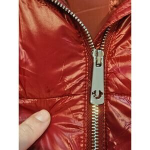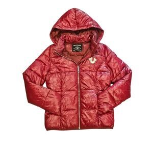 True Religion womens small puffer down hooded jacket red glossy horseshoe y2k