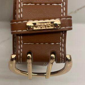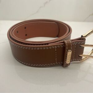 Elegant brown leather belt with a shiny gold buckle. Perfect for enhancing any outfit. Great Condition!