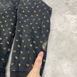 True Religion Mens Large Black Hoodie Sweater All Over Logo Print Pullover READ