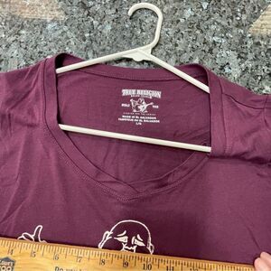 This True Religion t-shirt features the iconic Buddha playing a guitar graphic on the front, crafted in a soft maroon blend of 50% modal and 50% polyester. Size Large. Lightweight and comfortable with a flattering scoop neckline. Great for casual wear or fans of the brand’s signature style.