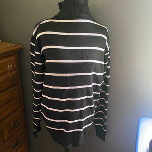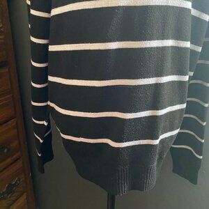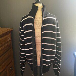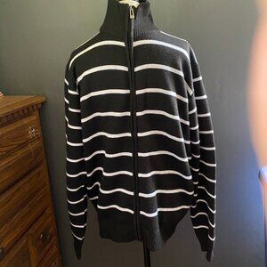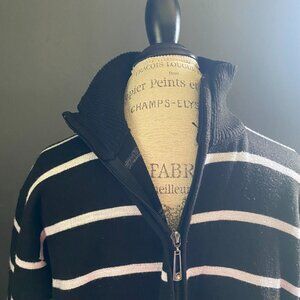 Sweater is tight knit with full zip front closure. High Neck. Long sleeve. Black with white horizontal stripes