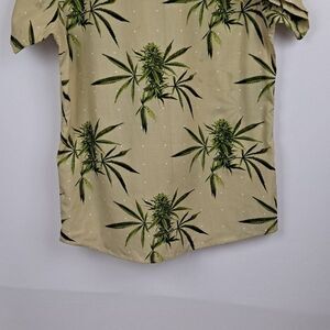 Tan with greens, size large. Collared, button front shirt with short sleeves, one chest pocket. 60% cotton, 40% polyester. Measures 44" chest, length is 31". Great with khakis.