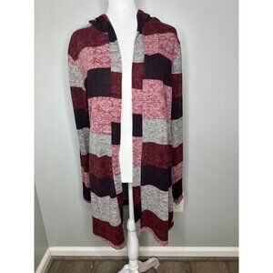 Indulge in the art of casual elegance with this hooded knit cardigan sweater by True Self. Designed in a harmonious blend of red and gray stripes, it provides both style and comfort. The cozy hood and open front design make it a versatile addition to your wardrobe.