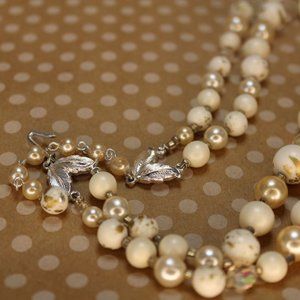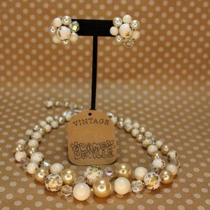 True Vintage 1950-60s Pearl, Gold, Glass Beaded Necklace and Earring Set